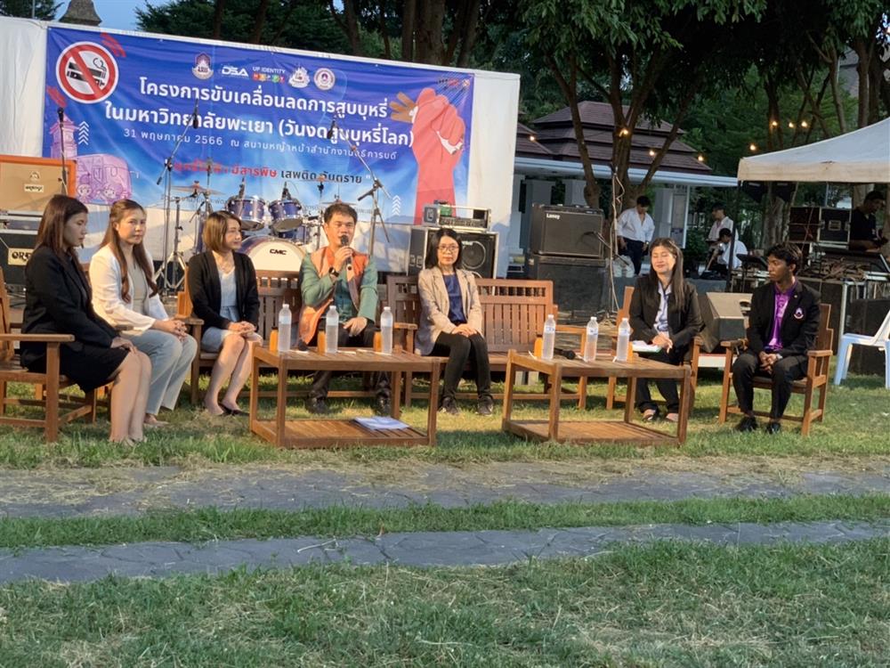 เมื่อวันที่ 31 พฤษภาคม 2566 เวลา 17.00 น. ผู้อำนวยการกองพัฒนาคุณภาพนิสิตและนิสิตพิการ นางสาวอำนวยพร ขัติวงศ์ เข้าร่วมโครงการขับเคลื่อนลดการสูบบุหรี่ในหมาวิทยาลัยพะเยา (วันงดสูบบุหรี่โลก) โดยมีวัตถุประสงค์เพื่อสร้างความรู้ ความเข้าใจโทษและพิษภัยของบุหรี่ไฟฟ้าให้กับนิสิตและบุคลากร รวมทั้งสร้างเสริมสิ่งแวดล้อมปลอดบุหรี่ตามกฎหมายด้วยการควบคุมยาสูบ อีกทั้งเข้าร่วมกิจกรรม กิจกรรมขยับกาย ห่างไกลบุหรี่และบุหรี่ไฟฟ้า ภายในงานยังมีกิจกรรม มินิคอนเสิร์ต กิจกรรมเสวนาในหัวข้อ บุหรี่ไฟฟ้ามีสารพิษ เสพติด อันตราย รวมทั้งประกาศการมอบรางวัลให้กับผู้ชนะในกิจกรรมประกวดคลิปวีดีโอสั้น Tiktok ณ ลานก๋างข่วง หน้าสำนักงานอธิการบดี มหาวิทยาลัยพะเยา