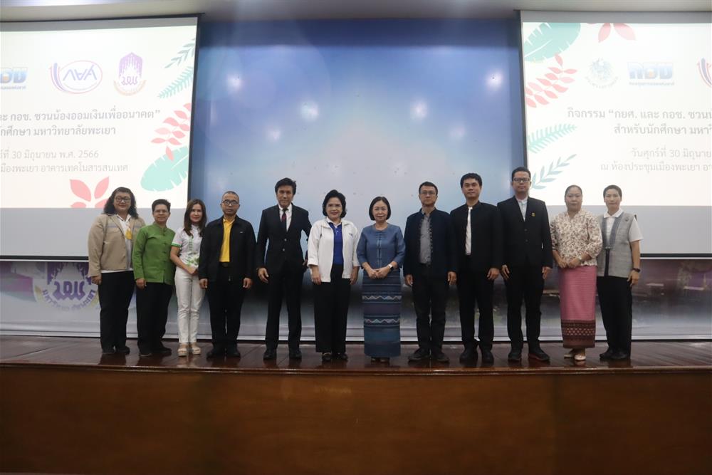 กองพัฒนาคุณภาพนิสิตและนิสิตพิการ มหาวิทยาลัยพะเยา ร่วมกับ กองทุนเงินออมแห่งชาติ และกองทุนเงินให้กู้ยืมเพื่อการศึกษา ร่วมกันจัดกิจกรรม “กยศ. และกอช. ชวนน้องออมเงินเพื่ออนาคต” และ โครงการส่งเสริมการออมกับกองทุนการออมแห่งชาติ (กอช.) “อนาคตทางการเงินสดใสได้ ด้วยการออมเงินในวันนี้” ในวันศุกร์ ที่ 30 มิถุนายน 2566 เวลา 09.00 – 12.00 น ณ ห้องประชุมเมืองพะเยา อาคารเทคโนโลยีสารเทศ มหาวิทยาลัยพะเยา การจัดกิจกรรมในครั้งนี้ มีวัตถุประสงค์เพื่อส่งเสริมให้นิสิต นักศึกษา ให้มีวินัยการออมต่อเนื่อง เพื่อส่งเสริมให้นิสิตที่กู้ยืมเงินกับกองทุนเงินให้กู้ยืมเพื่อการศึกษา ตระหนัก ถึงความสำคัญของการออมเงิน ปลูกฝังให้มีวินัยการออมเงินอย่างยั่งยืน และเพื่อเป็นการสร้างเครือข่ายการออมเงินของนิสิตนักศึกษาในสถานศึกษากับกองทุนการออมแห่งชาติ กิจกรรมในโครงการนี้ได้รับเกียรติจากวิทยากร คุณสาวจารุลักษณ์ เรืองสุวรรณ (เลขาธิการคณะกรรมการกองทุนการออมแห่งชาติ (กอช.) ให้ความรู้ในหัวข้อเรื่อง “การวางแผนการเงิน กับ กอช.” และ คุณชัยณรงค์ กัจฉปานันท์ (ผู้จัดการกองทุนเงินให้กู้ยืมเพื่อการศึกษา) ให้ความรู้ในหัวข้อเรื่อง “กยศ. รุ่นใหม่ รู้ใช้ รู้ออม เพื่อส่งต่อโอกาสให้รุ่นน้อง” ซึ่งโครงการนี้มีนิสิตมหาวิทยาลัยพะเยาที่กู้ยืมเงินกองทุนเงินให้กู้ยืมเพื่อการศึกษาเข้าร่วม จำนวน 350 ราย