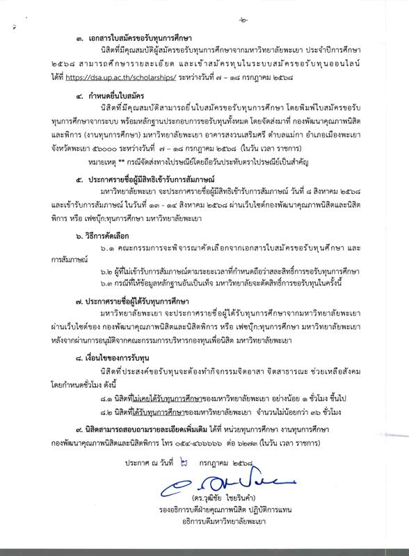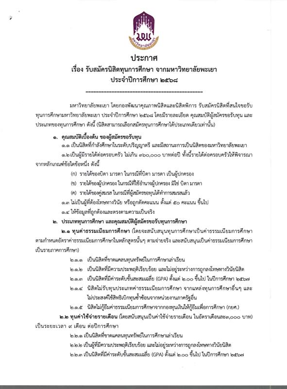 1. ประกาศมหาวิทยาลัยพะเยา เรื่อง รับสมัครนิสิตทุนการศึกษา ฯ