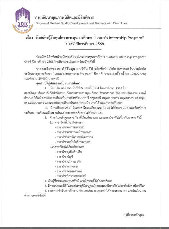 รับสมัครทุนการศึกษา โครงการทุนการศึกษา “Lotus’s Internship Program” ประจำปีการศึกษา 2568
