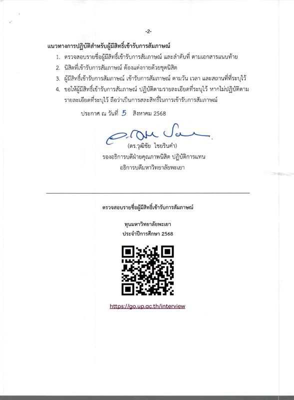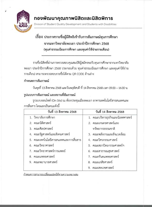 ประกาศรายชื่อผู้มีสิทธิ์เข้ารับการสัมภาษณ์ทุนการศึกษา จากมหาวิทยาลัยพะเยา ประจำปีการศึกษา 2568